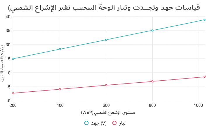 البيانات: في سيناريو افتراضي، قياسات الجهد والتيار بحسب مستويات الإشعاع الشمسي: