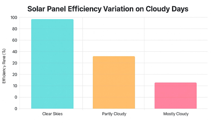 This bar chart shows the efficiency rates of solar panels under different weather conditions. Panels that operate at 100% efficiency in clear weather drop to around 60% on partly cloudy days and to as low as 15% on heavily cloudy days. This shows that solar panels do work on cloudy days, but their efficiency decreases significantly. Efficiency can vary depending on panel type (for example, the better performance of monocrystalline panels), cloud density, and the level of solar irradiance.