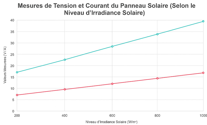Données : Dans un scénario hypothétique, mesures de tension et de courant en fonction des niveaux d’irradiance solaire :