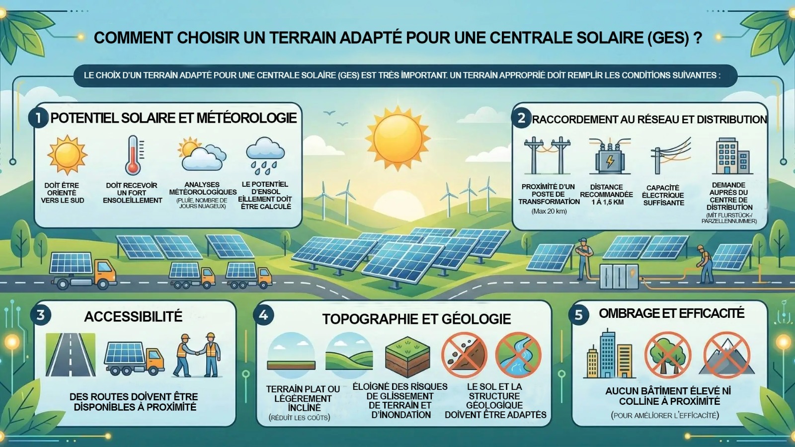 - Afin que le rendement ne baisse pas, il ne doit pas y avoir de hautes constructions ni de collines autour du terrain de la GES.