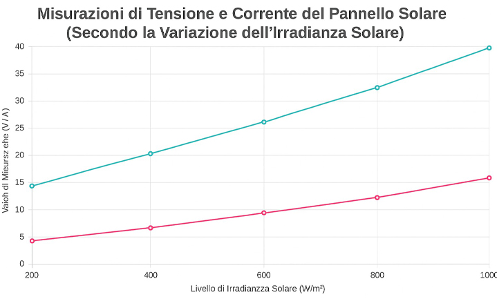 Questo grafico lineare mostra come i valori di tensione e corrente misurati con il multimetro aumentano con il livello di irraggiamento solare. Ad esempio, a 200 W/m² la tensione è di 20 V e la corrente di 2 A, mentre a 1000 W/m² questi valori raggiungono rispettivamente 40 V e 10 A. Ciò indica che il pannello funziona in condizioni ottimali e conferma l’affidabilità della misurazione con il multimetro. Se i valori sono inferiori alle aspettative, potrebbe esserci un guasto al pannello o un problema di connessione.